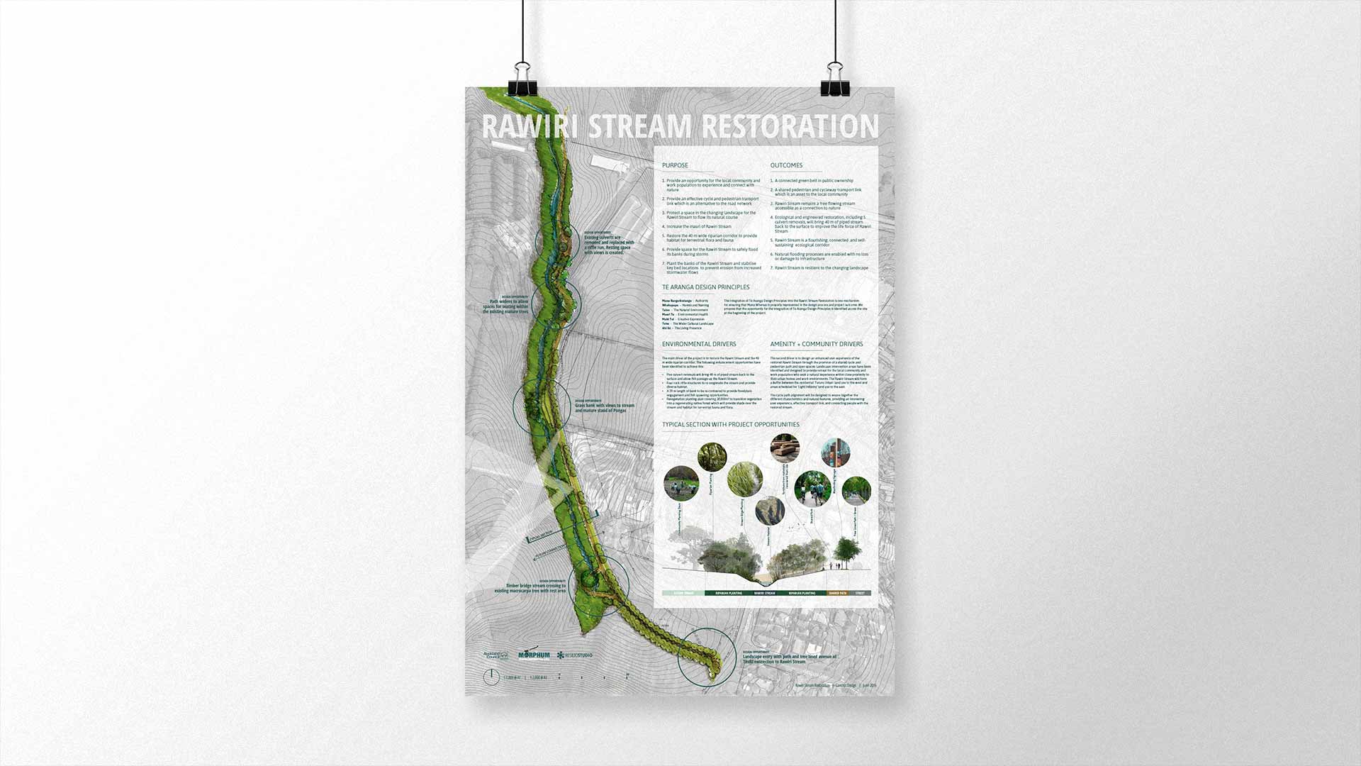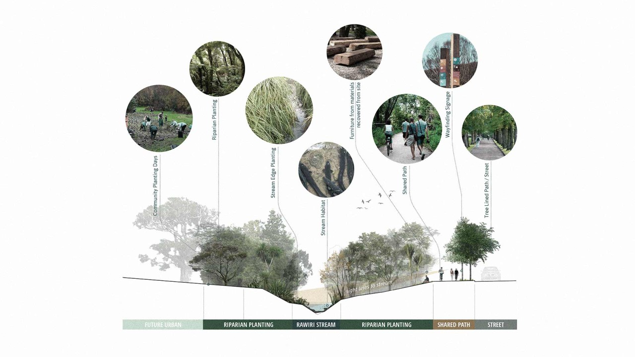 Resilio was engaged to produce a landscape concept and detailed design for the restoration of an 830m section of Rawiri Stream located in Hobsonville. The Rawiri Stream project aims to maximise the ecological value of the stream and provide landscape amenity and access for the local community through the integration with a recreational trail. Resilio developed a landscape strategy which proposes a range of nodes and thresholds along the stream, which respond to the varying landscape characters and ecological niches. Resilio was engaged to help identify engineered, ecological and landscape enhancement opportunities, as well as celebrate the proposed engineering interventions and employ re-use to provide seating, signage and wayfinding elements derived from site items to be demolished (culverts) or vegetation to be cleared (Macrocarpa timber). In addition the expertise of the Resilio team was employed to aid in establishing an appropriate ecological planting strategy for the 40m wide riparian corridor. Resilio Studio will be providing detailed design and construction observation for Rawiri Stream beginning June 2018.