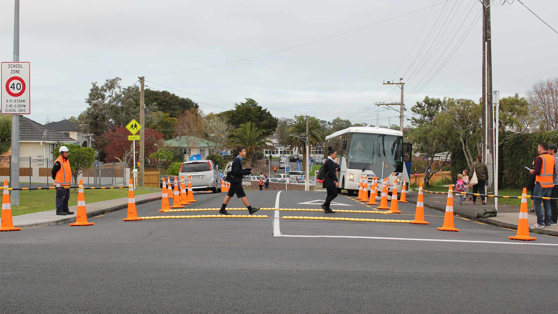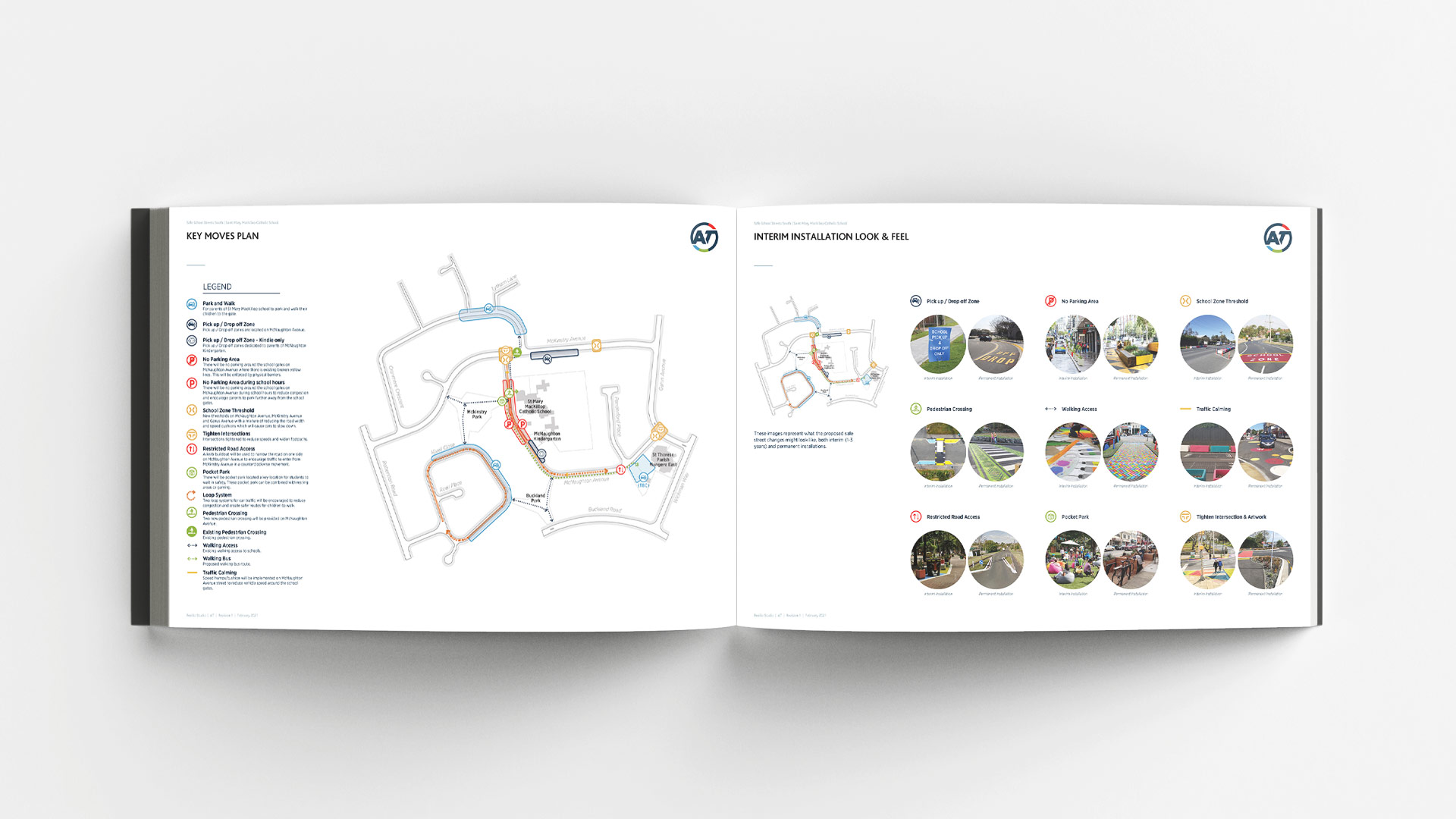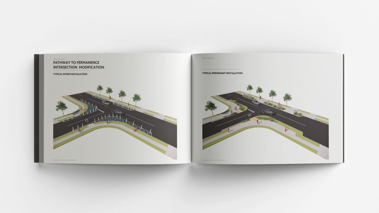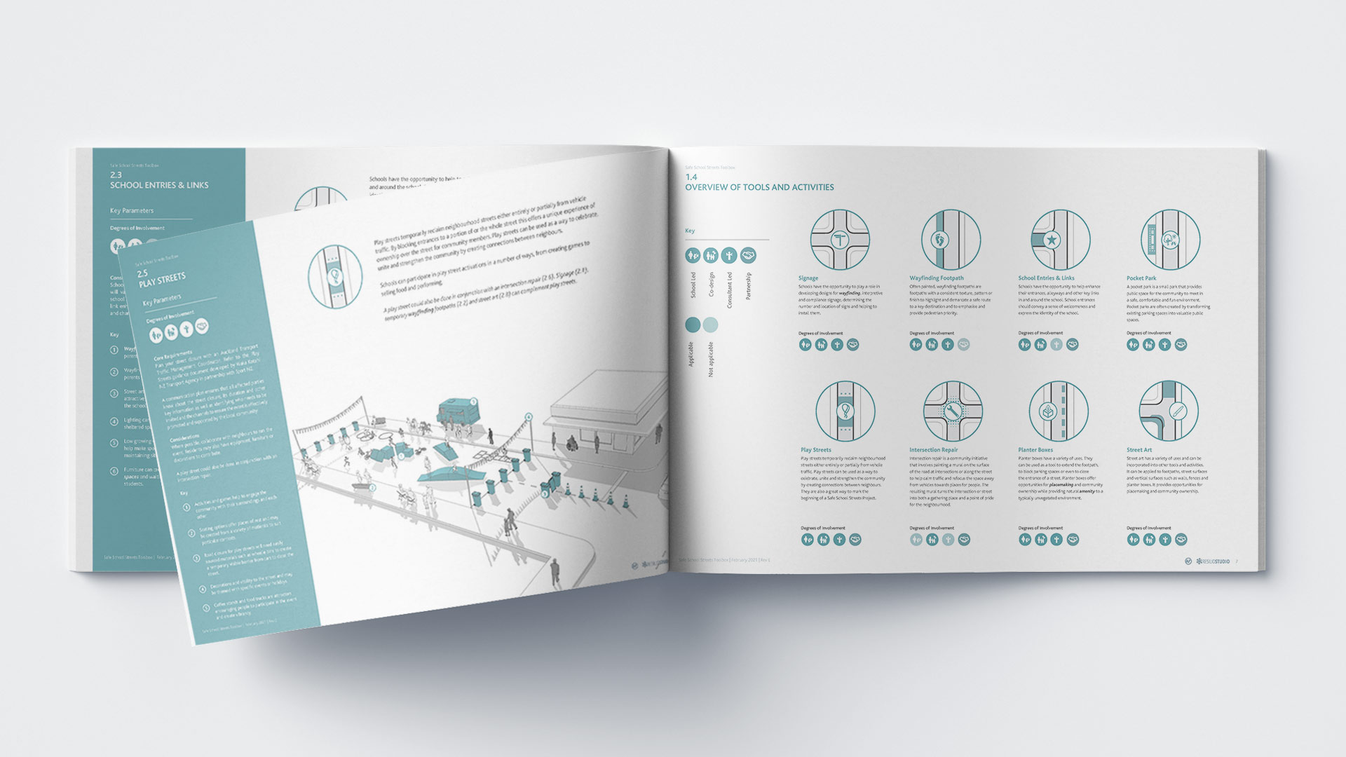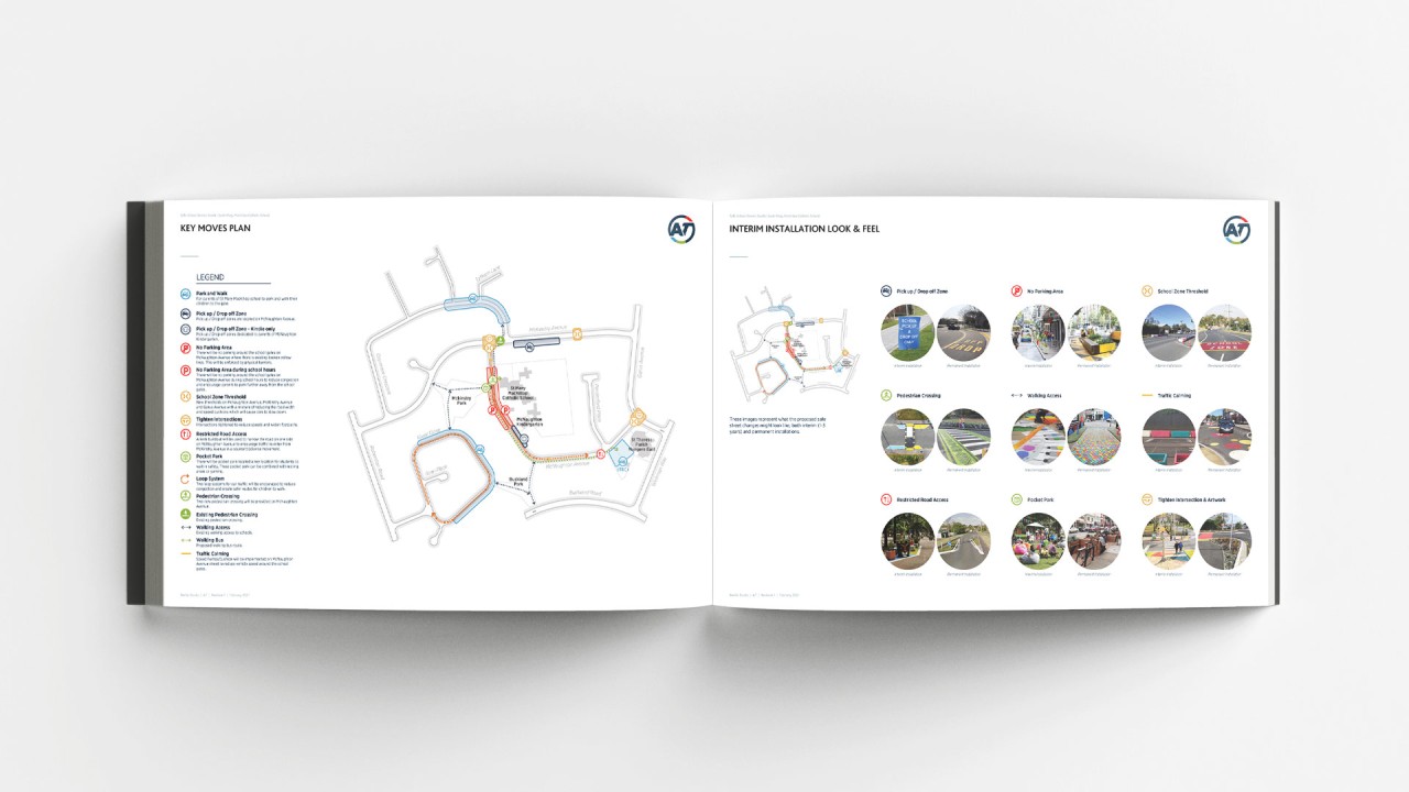 Resilio Studio have been engaged by Auckland Transport's Walking, Cycling and Safety team to develop designs to be trailed outside of schools to increase safety at the school gate and to reduce congestion and illegal parking. The design proposal resulted in a ‘tool box’ of interventions that can be applied to a wide range of contexts and conditions at varying degrees of permanence, reflecting the experimental and controversial nature of some tools. Included within the tool box are ‘tools for placemaking’ which provide opportunities for school staff and students as well as parents and local community members to directly engage in the planning, design and implementation of features to improve safety, traffic management and amenity of school entrances and the surrounding street network, and provides opportunities to integrate some of the interventions into the schools’ curricula.